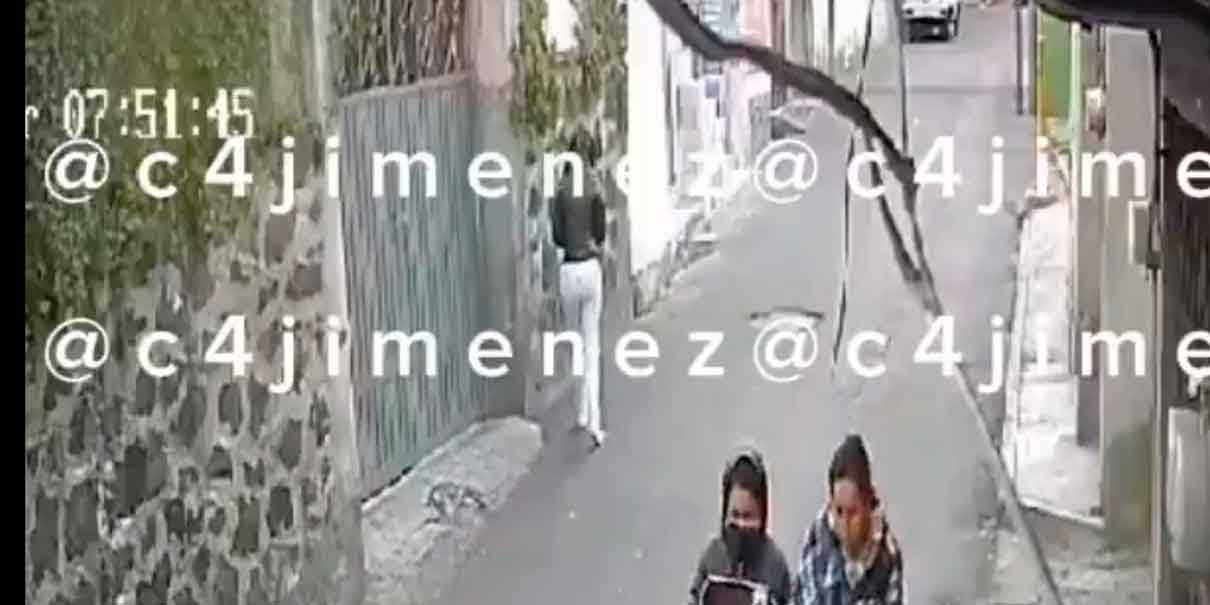 En el video se observa a la mujer, vestida con pantalón blanco y chamarra negra, caminando por una calle estrecha alrededor de las 07:51 horas, momentos después de haber dejado a sus hijas en la escuela.