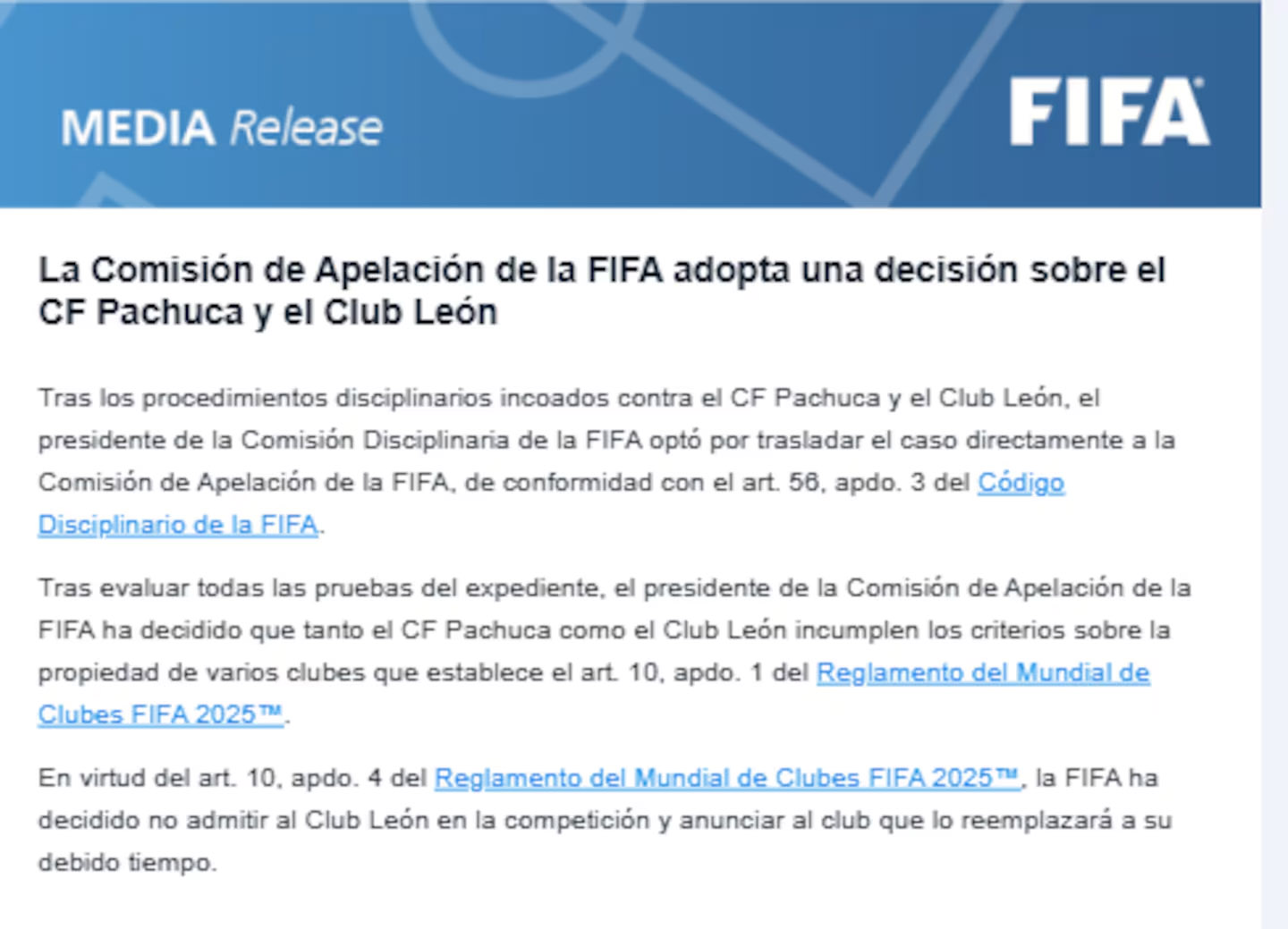 “El artículo 10, apartado 4, del Reglamento del Mundial de Clubes FIFA 2025 establece que, debido a la multipropiedad, el Club León no será admitido en la competición. En su lugar, se anunciará al club sustituto en su debido tiempo”, detalló el comunicado oficial.