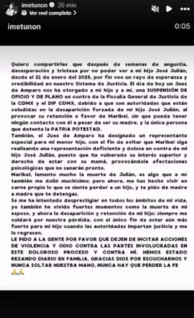 En un comunicado publicado en sus redes sociales, la viuda de Julián Figueroa reveló que un Juez de amparo decidió otorgarle una suspensión de oficio y plano en contra de la Fiscalía General de Justicia y el DIF de la CDMX, luego de que éstas le concedieran la tutela temporal del menor a Maribel.