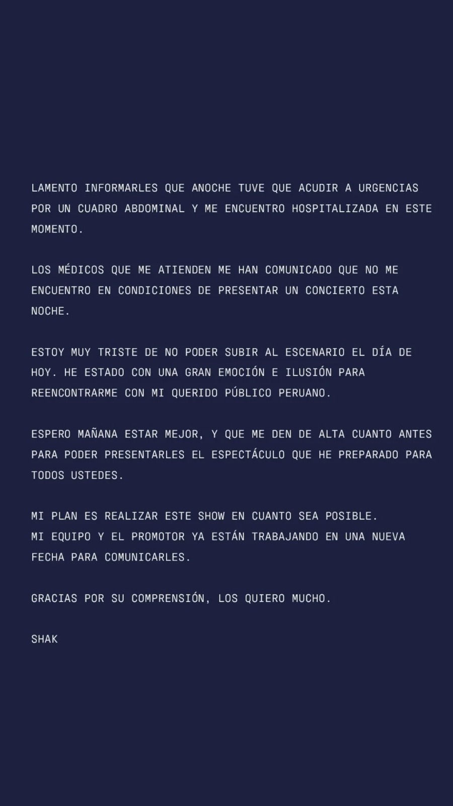 "Me encuentro hospitalizada en este momento. Los médicos que me atienden me han comunicado que no me encuentro en condiciones de presentar un concierto esta noche", escribió Shakira.
