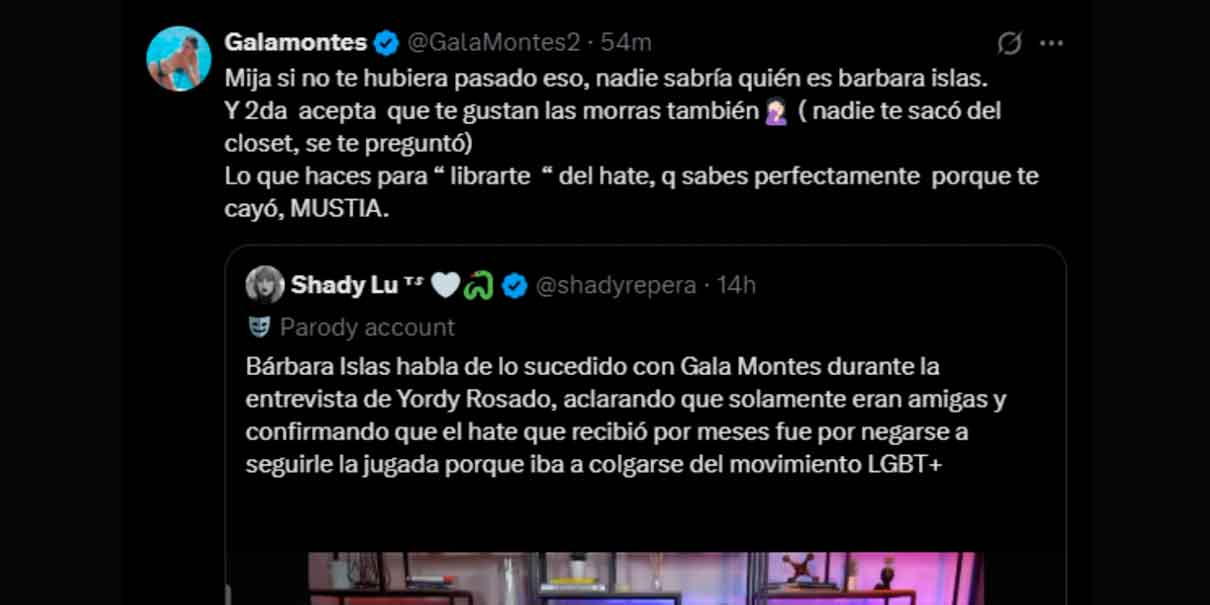 Tras estas declaraciones, Gala Montes utilizó su cuenta de X (antes Twitter) para desmentir a Bárbara Islas, calificándola de “mustia” y asegurando que fue ella misma quien le dio permiso para hablar sobre su supuesta relación.