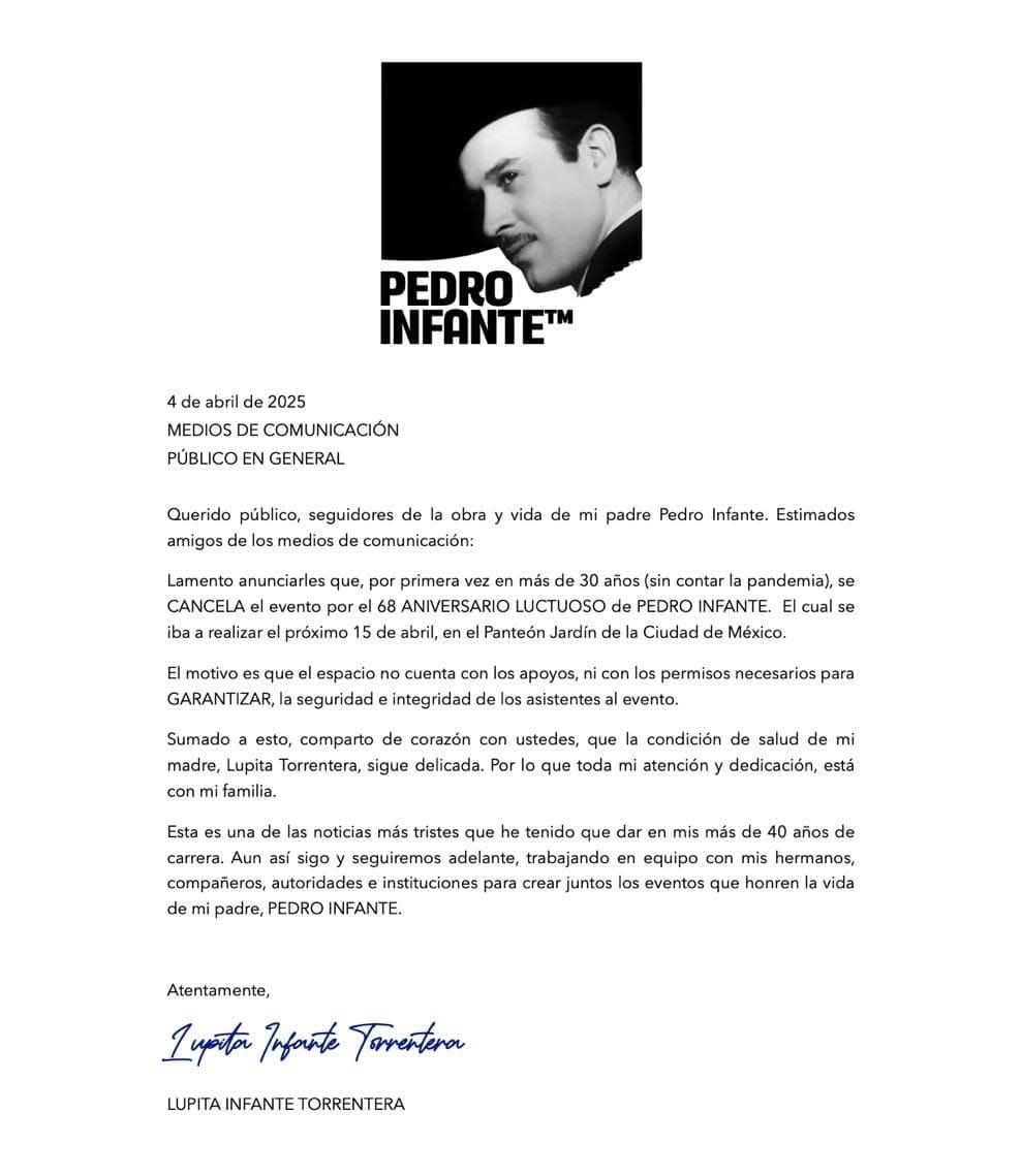A pesar de la cancelación, Lupita Infante aseguró que seguirá trabajando en equipo con sus hermanos, compañeros y autoridades para organizar futuros eventos que honren la memoria de su padre.
