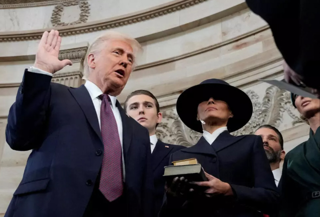 En otro episodio de la jornada, el presidente de Estados Unidos, Donald Trump, prestó juramento el lunes con su mano derecha levantada, pero sin colocar su mano izquierda sobre las dos Biblias que su esposa Melania sostenía mientras estaba a su lado.