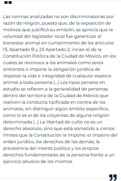 Lo anterior derivado del caso de una mujer practicante de la santería cubana impugnó los artículos mencionados al afirmar que los motivos religiosos son válidos para maltratar a los animales.