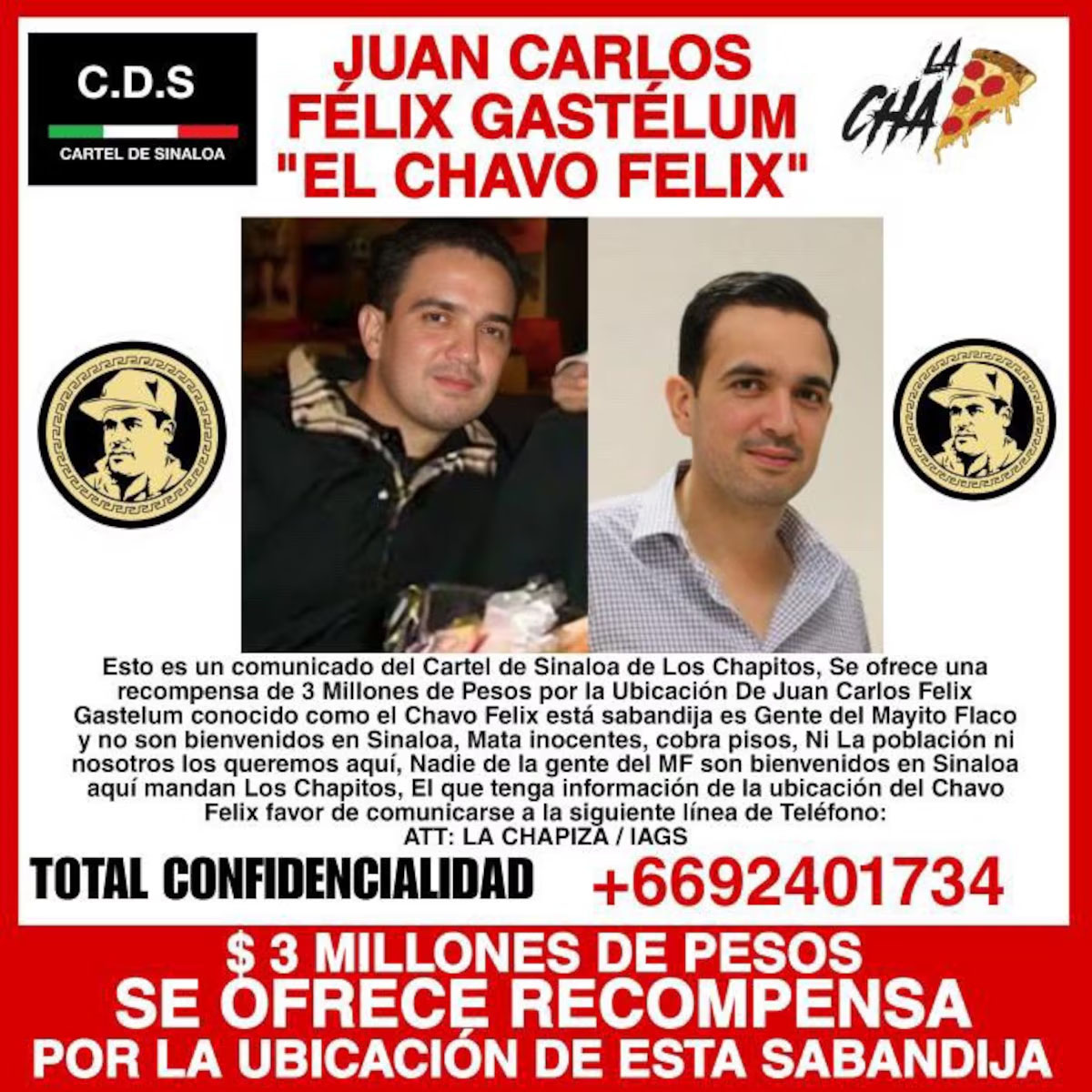 La estrategia de Los Chapitos de ofrecer recompensas por miembros clave de la facción rival ha sido un elemento recurrente en la guerra interna dentro del Cártel de Sinaloa, que se desató desde el pasado 9 de septiembre. La primera recompensa que apareció fue cuando Los Chapitos ofrecieron 3 millones de pesos por Juan Carlos Félix Gastélum, alias "El Chavo Félix", operador de La Mayiza y esposo de Teresita Zambada Ortiz, hija de "El Mayo".