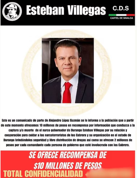 La publicación también promete 2 millones de pesos por cada funcionario que se demuestre que protege a esta facción. El mensaje difundido señala: "A partir de este momento ofrecemos 10 millones de pesos en recompensa por información que conduzca a la captura y/o muerte del narco gobernador de Durango Esteban Villegas por su relación y cooperación para cuidar a los narcoterroristas de Los Cabrera y su organización en el estado de Durango, brindándoles seguridad y libre distribución de drogas. Se ofrecen 2 millones de pesos por cada comandante y persona de gobierno que esté involucrado con Los Cabrera. SE OFRECE RECOMPENSA DE $10 MILLONES DE PESOS TOTAL CONFIDENCIALIDAD".