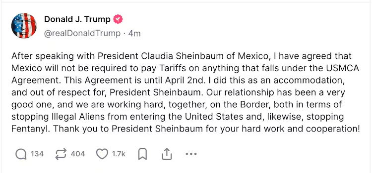 Asimismo, confirmó lo anunciado por el republicano sobre la exención de aranceles para los productos incluidos en el T-MEC, al menos hasta el 2 de abril.