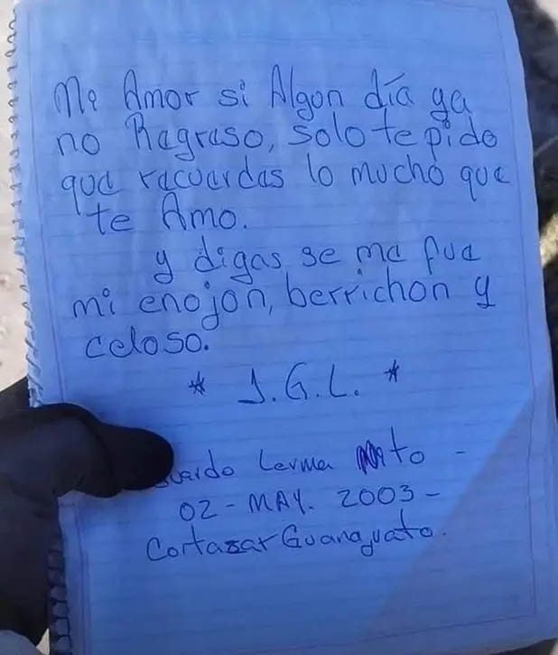📝 "Mi amor, si algún día ya no regreso, solo te pido que recuerdes lo mucho que te amo. Y digas: se me fue mi enojón, berrinchón y celoso. JGL. Eduardo Lerma Nito, 2 de mayo de 2003, Cortázar, Guanajuato."