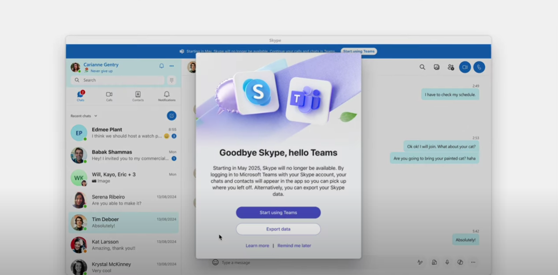 A partir de esa fecha, Skype dejará de estar operativo y los usuarios no podrán acceder a sus mensajes antiguos ni a otras funcionalidades de la aplicación. Sin embargo, Microsoft ha facilitado la transición a Teams, permitiendo a los usuarios iniciar sesión en esta plataforma con sus credenciales de Skype, donde encontrarán sus chats y contactos intactos.